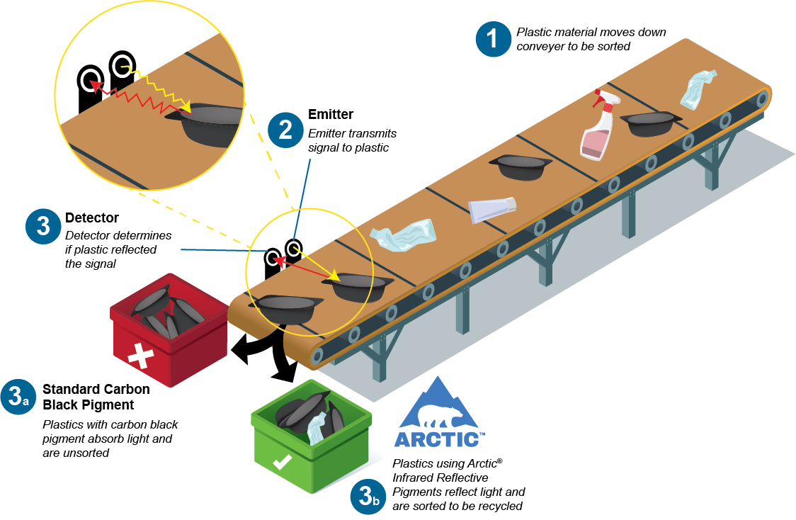 - Plastics using Arctic Infrared Reflective pigments reflect light and are sorted to be recycled